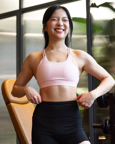 Weiyu wears Size 6 paired with Gear Up Shorts in Powder Pink.